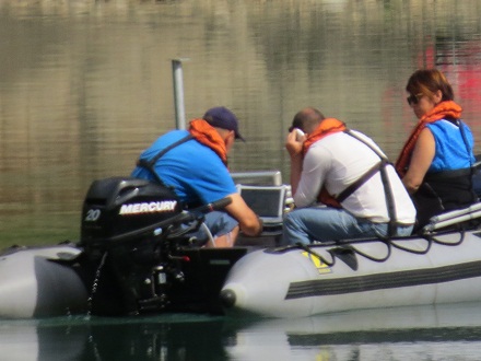 Dommage de na pas voir le correctement l'élément au milieu du zodiac, il pourrait s'agir d'un ADCP, Acoustic Doppler curantométric profiler, si c'est le cas. C'est un capteur qui permet de mesurer les courants en profondeur, il y des études sur les lacs avec ce genre de capteur.