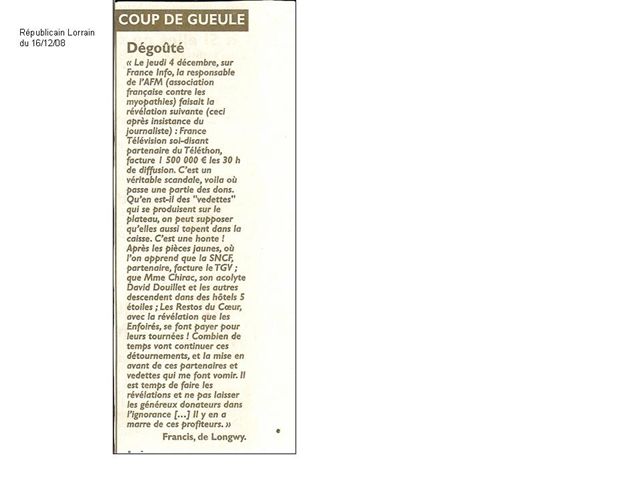 Perso même pour le teleton, où j'ai activement participé au debut,je ne suis plus là...de cette manière. je ne cautionne plus.