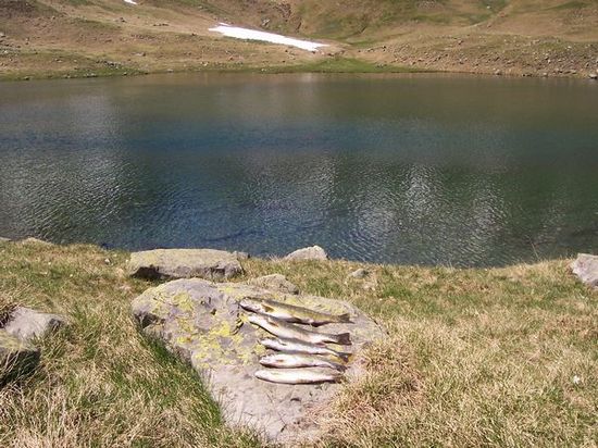 Sortie au lac d'Aule aujourd'hui,super temps mais très froid à cause du vent de nord,le matin les truites et saumons de fontaine étaient timides,réveil l'àprès midi le vent s'étant calmé mais pas de gobages .
