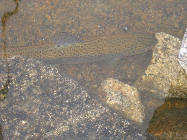 En ce qui concerne l'absence de point rouge, je ne connais que deux ruisseaux où les truites présente cette particularité, le Quioulès et la Sabine, mais entre ces deux ruisseaux il existe encore une différence, la robe. Sur le Quioulès les belles présentent une robe jaune vif, souvent zébrée alors que les cousines de la Sabine sont plus argenté (Sabine, fond constitué à majorité de shiste et sable clair, Quioulès fond constitué à majorité de petit gravier et sable fin sur les zones d'accumulation, couleur jaune clair à marron clair).