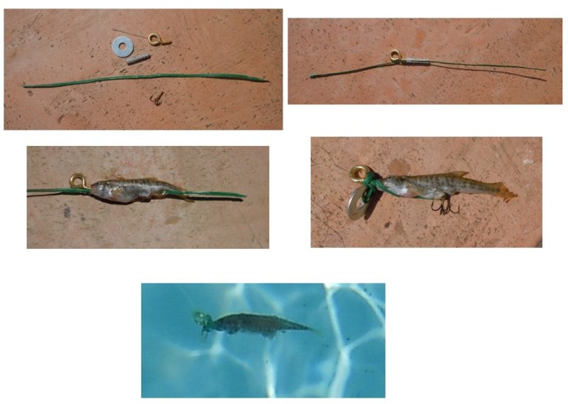 Montage : on passe le fil de fer dans la cheville, on visse le piton, le fil de fer est ainsi solidaire du piton. On perce ensuite le vairon avec le fil de fer, dans le sens gueule vers queue puis on enfonce la cheville dans la gueule du vairon,