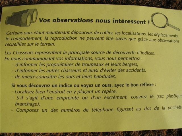 Comme tout bon chasseur, il attend la faille de l'homme pour pouvoir atteindre sa proie, se régale, laissant derrière lui "la polémique".A Siguer, il est venu plusieurs fois, nous le savons car nos patous (chiens de protections), ont aboyé très souvent depuis 2 mois. Par ailleurs nous avons eu une brebis qui est revenue à la bergerie avec son pi (mamelle) mangé. (Pas morte, elle a été remboursée, car elle est perdue pour la production).Un rucher à eu des dégâts comme tous les ans car n'ayant pas assez de ruches (minimum 10), les propriétaires n'ont pu bénéficier d'aides pour la protection. Ils sont seulement indemnisés. Par contre les 2 autres ruchers plus importants ayant bénéficié des moyens de protection n'ont pas eu de prédation cette année.