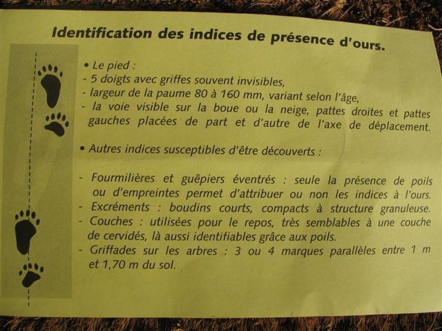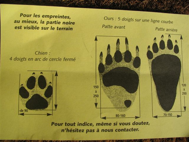 Pour le cas de notre exploitation, aucune brebis prédatée en bergerie ou en parc la nuit, car nos patous font leur travail. Seulement, en début de saison, ayant peu d'herbe, les brebis sont gardées plus largement et certaines ne rentrent que le lendemain matin faire téter leurs agneaux. Le boisement étant important, sur et autour de l'exploitation, l'ours à facile à atteindre sa proie, les patous perdant de leur efficacité, dans ces cas là. Jusqu'au 1 er juin, nous nous doutions que c'était l'ours qui faisait aboyer nos patous, mais cela restait une incertitude. Aujourd'hui nous pouvons affirmer sa présence sur notre exploitation, car un de nos garçons, en allant rejoindre ses frères qui gardaient le troupeau, a trouvé de belles traces que nous avons photographiées.