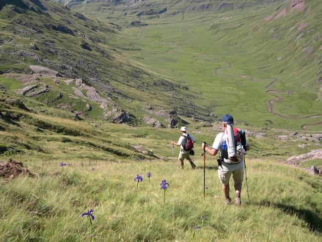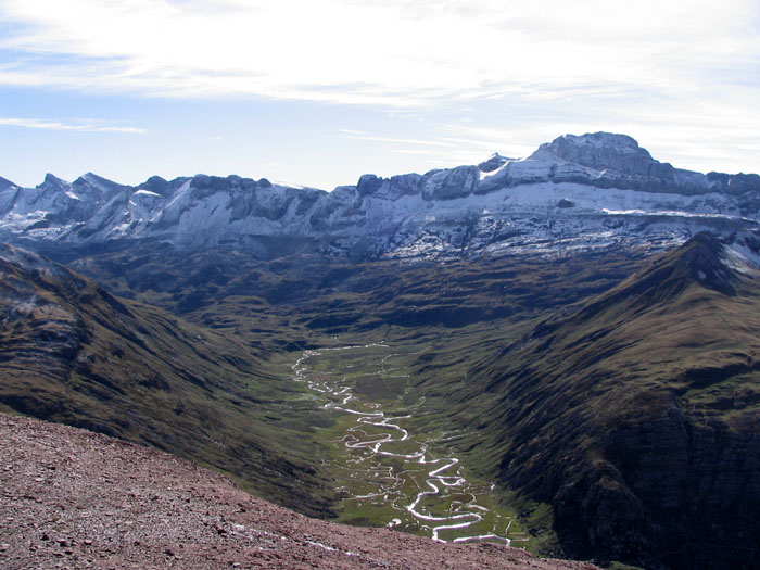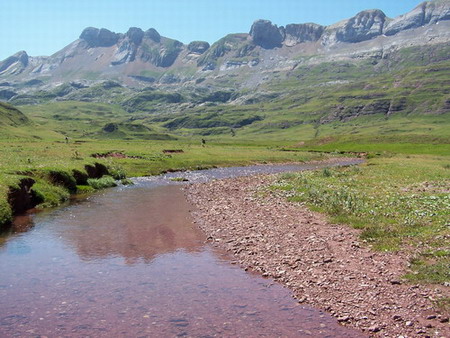 Buen dia Paco. Préciosa foto que me parece sacada desde el cordal fronterizo. De frente: El Castillo de Acher, el Visaurin y los picos de Bernera. De verdad, es muy agradable quitarse las botas de montaña y pasear descalzo. Pero, cuidado con las viboras escondidas en las hierbas, cerca de los rios, fuentes y manantiales. Nota bene: Por suerte el rio Aguas Tuertas es "Vedado de Pesca" Un saludo.