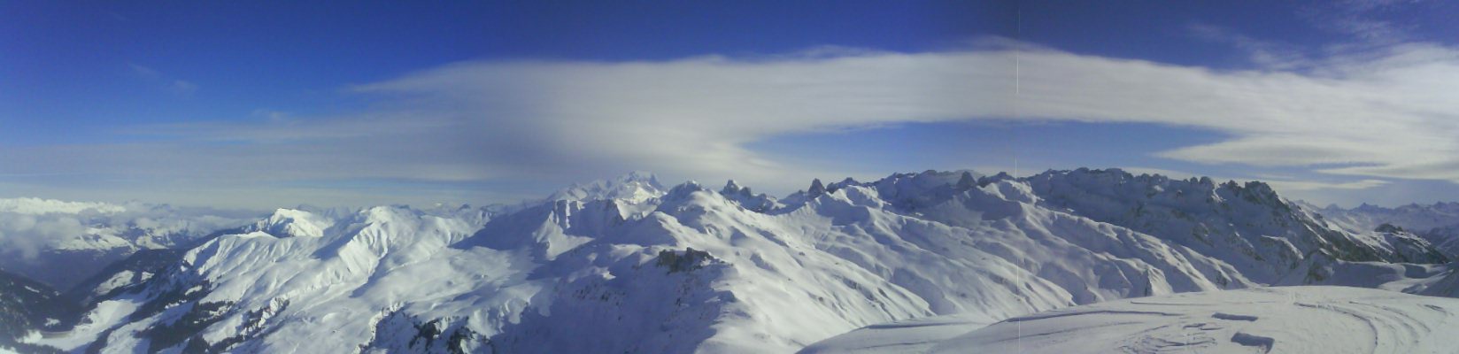 un petit panorama alpin vu depuis le crey du rey, un sommet en beaufortain ou je m'entraine en ski de rando, et pour ceux qui connaissent, on peut voir de gauche a droite la chaine des aravis, le MONT BLANC, les aiguilles de bionassay, la pierra menta