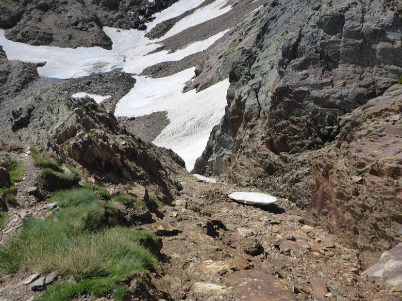 Tout passe bien mais arrivés à l'étang des Tables du Montcalm, les choses changent. Il y a un beau névé bien raide avec une neige bien dure qui barre le passage. Sans crampons, çà ne passait pas. On a donc contourné la difficulté par la droite en escaladant un petit peu pour rejoindre le haut du couloir.