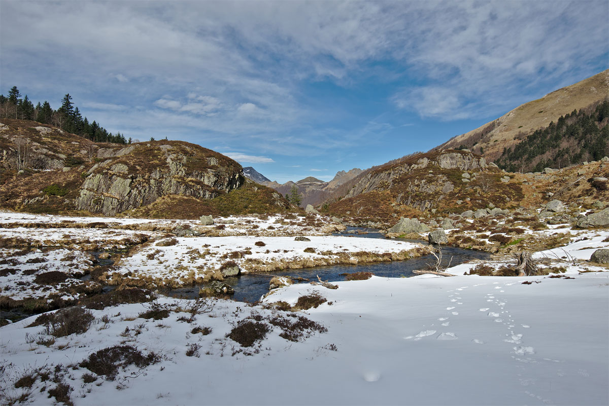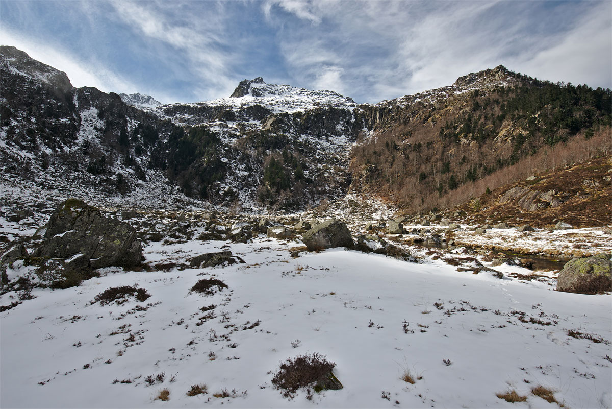 étang du Garbet qui n'a pas abouti à cause des conditions de neige et glace au dessus de barres rocheuses que j'ai jugées trop dangereuses malgré les raquettes et les crampons.