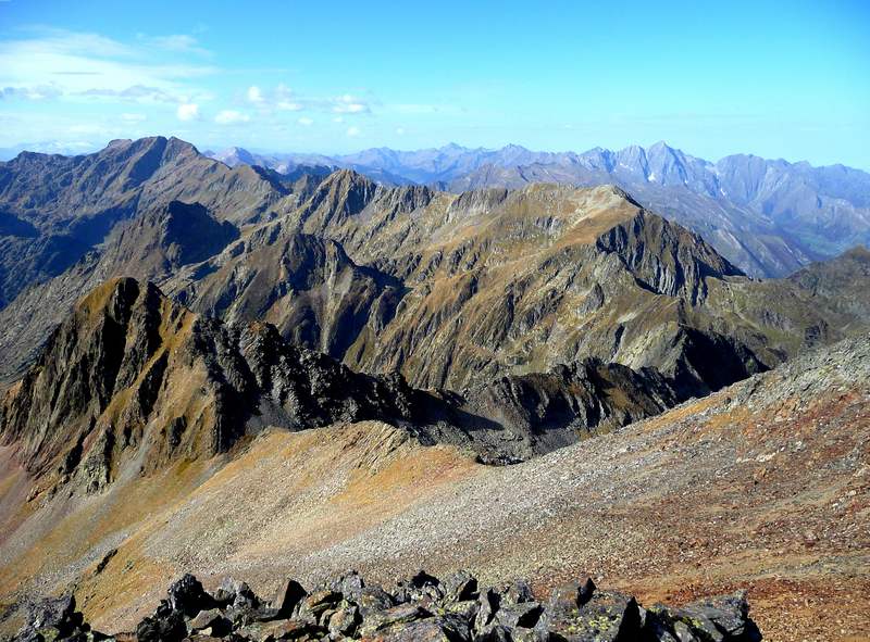 Vers l’Ouest : Au premier plan, le col de l’Aliot et le pic de Marterat. Plus loin derrière les Rouch, on devine la Maladetta et plus à droite : Maubermé, Barlonguère, et Valier.