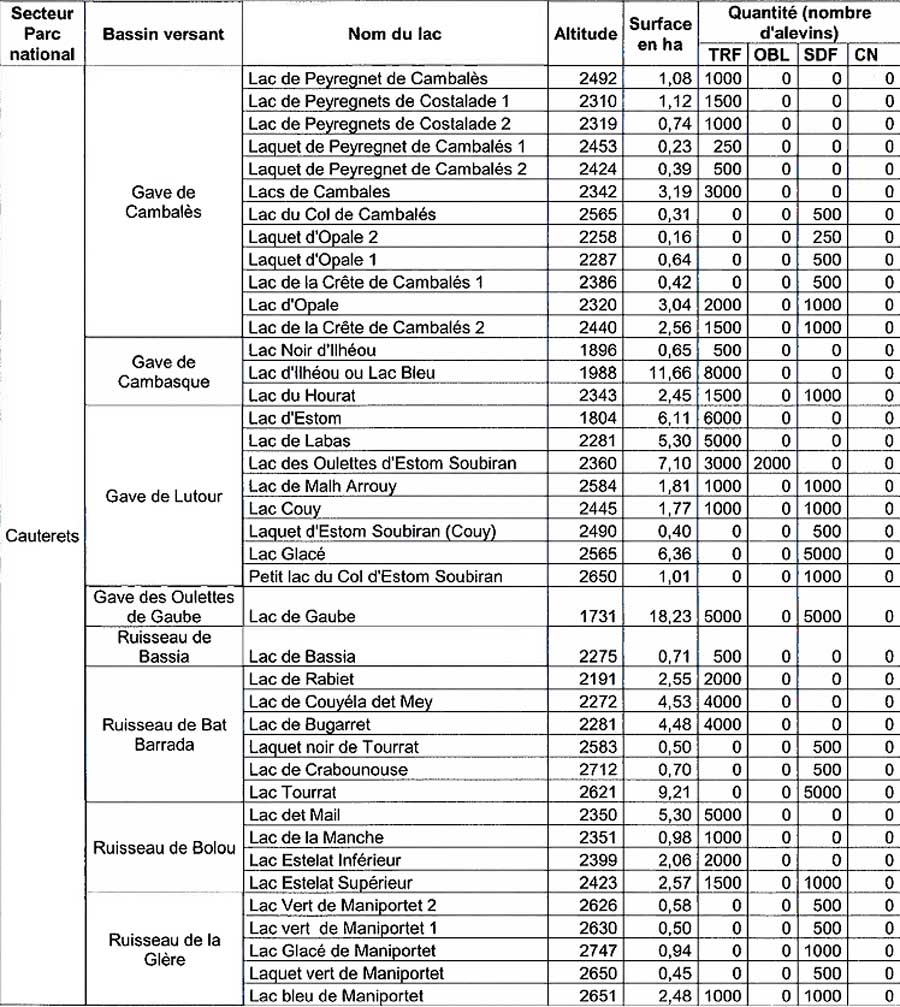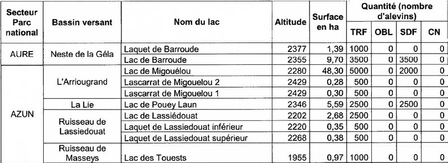 L'alevinage concerne plusieurs lacs dans les secteurs d'Aure, Azun et Cauterets.