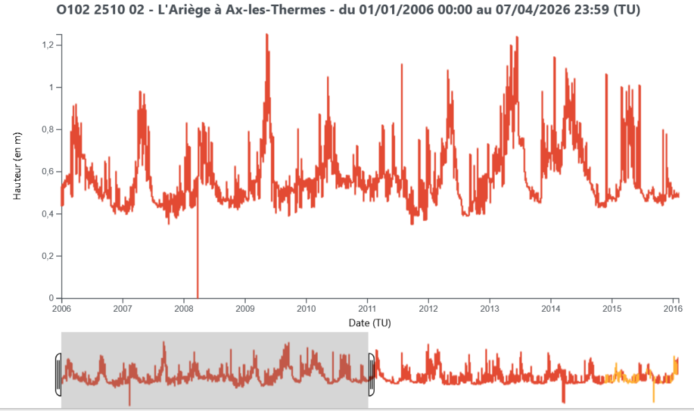 Voici l'hydrométrie sur 2006-2016 à la station d'AX-les-Thermes sur l'Ariège (source hydro.eaufrance)
